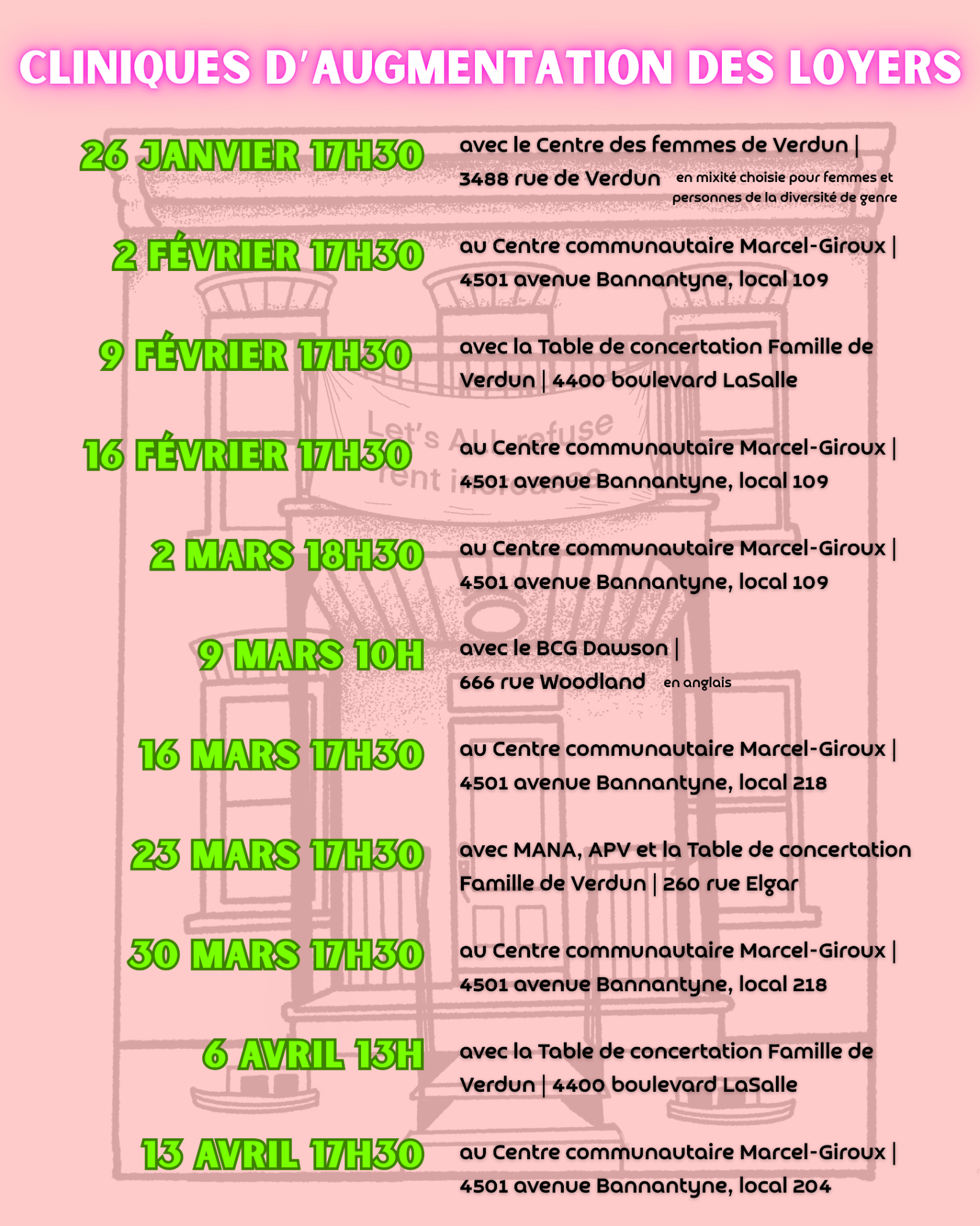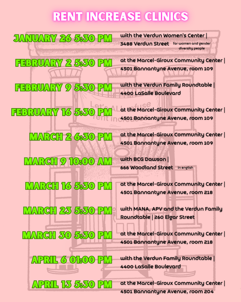 It will take place every Monday from late January to mid-April. During these free workshops, which last about two hours, there will be a general presentation on the situation regarding rent increases and individual consultation time to help each tenant deal with their rent increase notice.